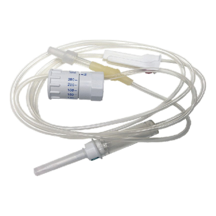 Deflussore a tamburo rotante, scala per soluzioni normali e dense, regolabile da 5 a 250 ml/h, con punto di iniezione a valle, raccordi Luer Lock, filtro aria antibatterico con tappino di chiusura.